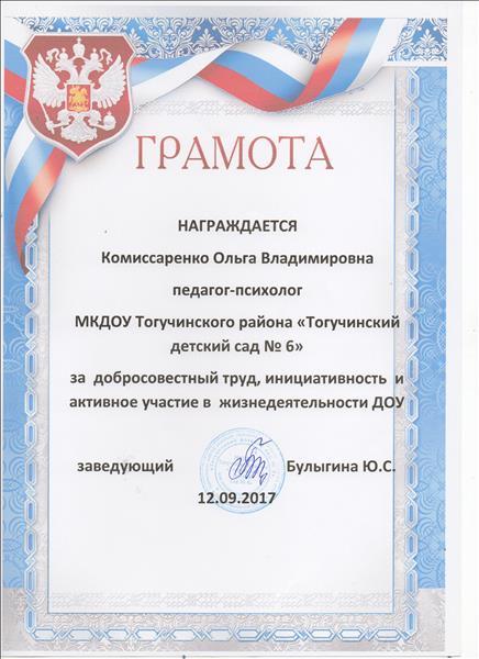 Грамота за 1 место в конкурсе на лучшую первичную профсоюзную организацию среди отраслевых профсоюзов Тогучинского района. Председатель РК профсоюза работников образования Ребенкова.Л.А.
