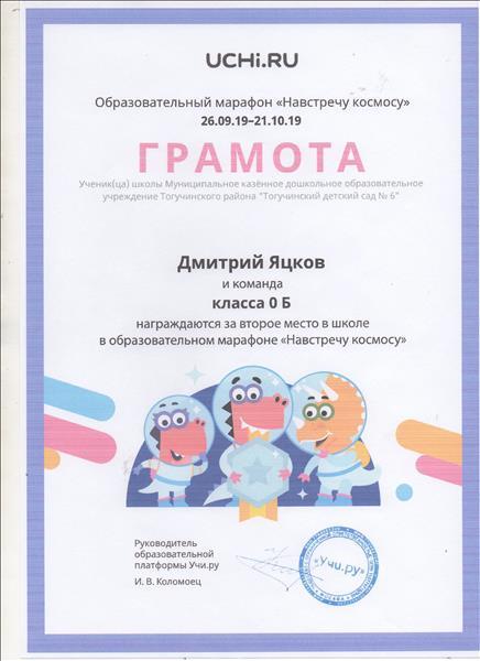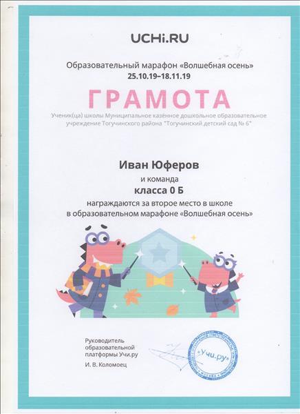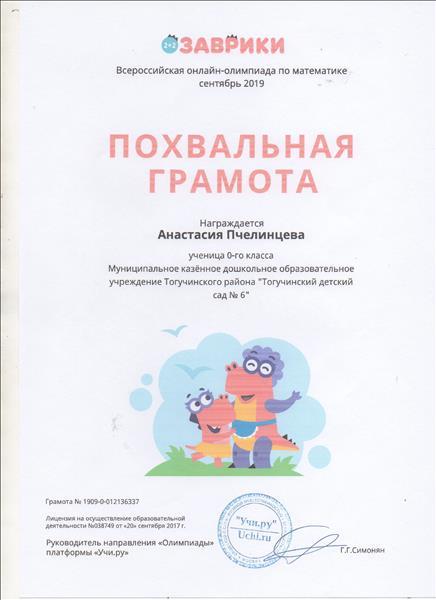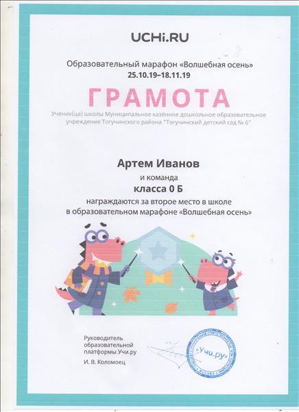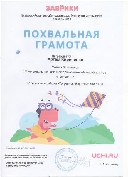 Похвальная грамота воспитанника ДОУ Всероссийская онлайн-олимпиада Учи.ру по математике октябрь 2018