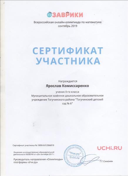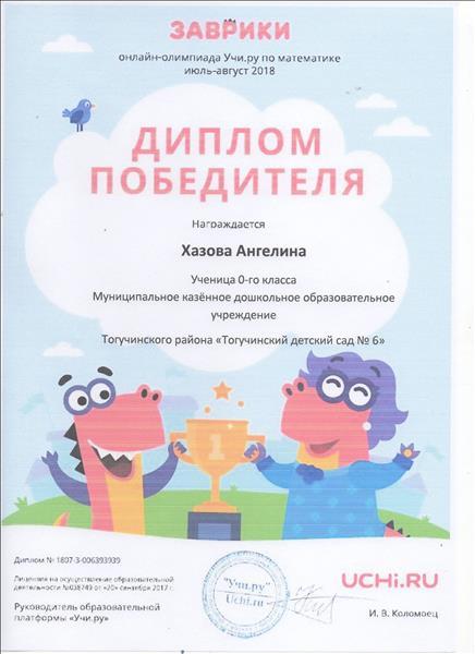 Диплом победителя воспитанника ДОУ Онлайн-олимпиада Учи.ру по матеиатике июль-август 2018