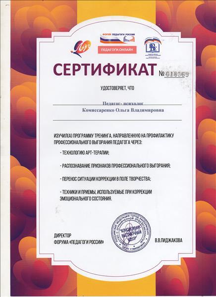 Сертификат "педагоги онлайн" о изучении программы тренинга, направленную на профилактику профессионального выгорания педагога....