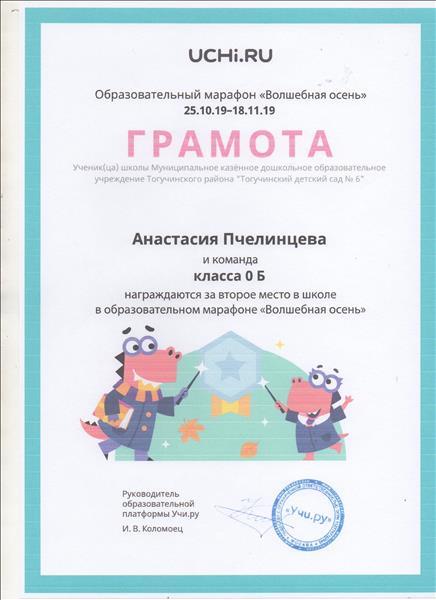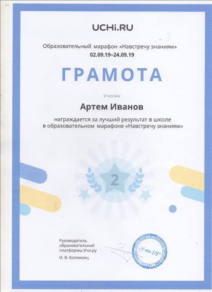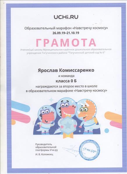 Платформа Учи.ру. Грамота команде "Смешарики" за I место в образовательном "Школьном марафоне"