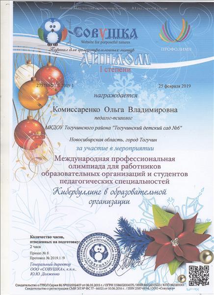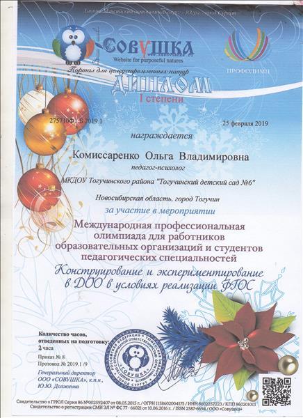 Совушка. Международная профессиональная олимпиада для работников образовательных организаций и студентов педагогических специальностей. Диплом I степени