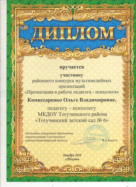 Управление образования администрации Тогучинского района НСО. Диплом участника районного конкурса мультимедийных презентаций "Презентация в работе педагога-психолога"