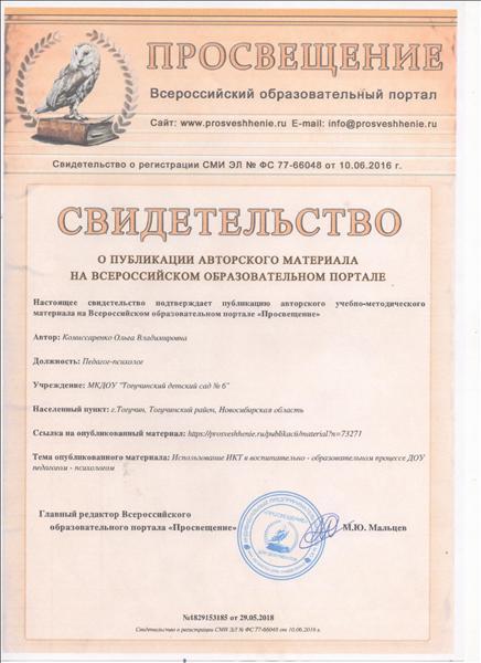 Свидетельство о публикации авторского материала на всероссийском образовательном портале "Просвещение" Использование ИКТ в воспитательно- образовательном процессе ДОУ педагогом- психологом