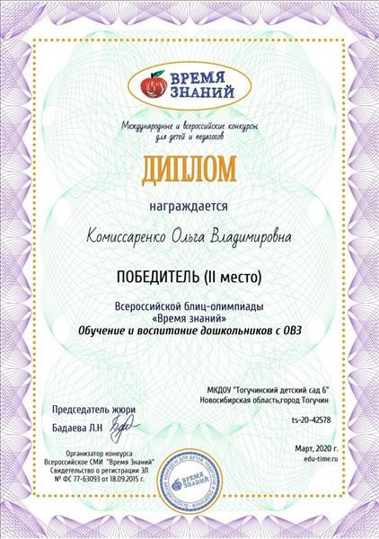 Время Знаний. Диплом II место Всероссийской блиц-олимпиады "Время знаний" Обучение и воспитание дошкольников с ОВЗ