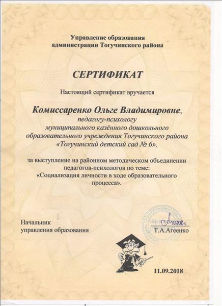 Сертификат за выступление на районном методическом объединении педагогов- психологов по теме: "Социализация личности в ходе образовательного процесса" Управление образования администрации Тогучинского района
