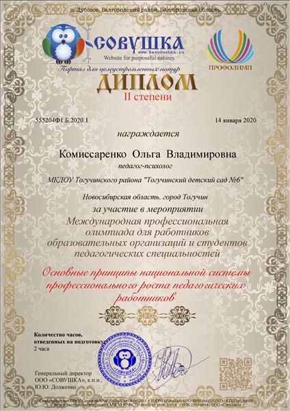 Диплом II степени за участие в мероприятии Международная профессиональная олимпиада для работников образовательных организаций и студентов педагогических специальностей "Развитие психологической службы в системе образования в Российской Федерации на период до 2025 года " ООО Совушка