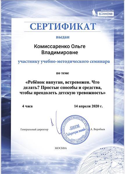Лаборатория знаний "Бином" Сертификат участника учебно -методического семинара по теме: "Ребенок напуган,встревожен. Что делать? Простые способы и средства, чтобы преодолеть детскую тревожность"