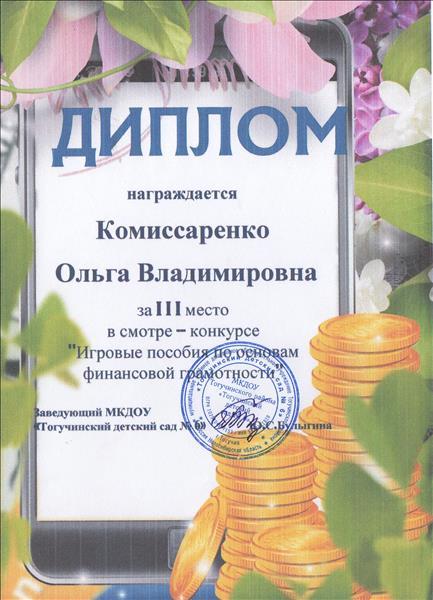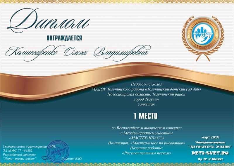 Диплом за 1-е место во Всероссийском творческом конкурсе с Международным участием "Мастер- класс" Номинация : "Мастер класс по рисованию"Название работы: "Рисунки цветным песком" Интернет- портал "Дети- цветы жизни"
