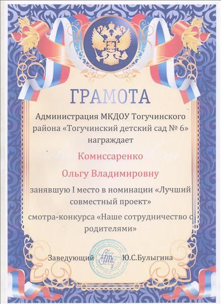 I место в номинации ""Лучший совместный проект" смотра-конкурса "Наше сотрудничество с родителями"