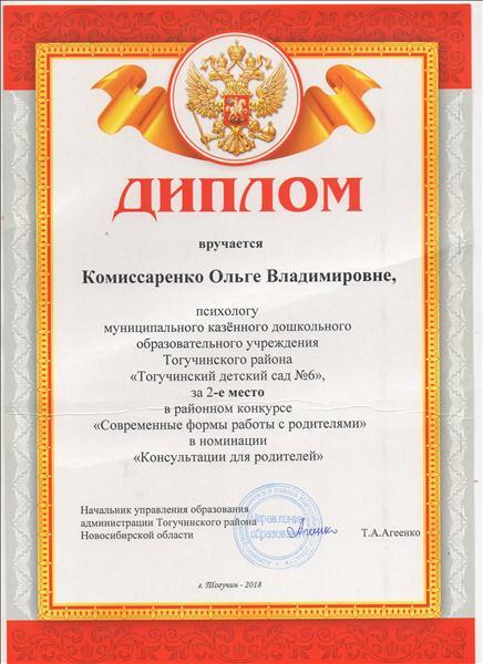 Диплом за 2-е место в районном конкурсе "Современные формы работы с родителями" в номинации "Консультация для родителей" Управление образования администрации Тогучинского района Новосибирской области