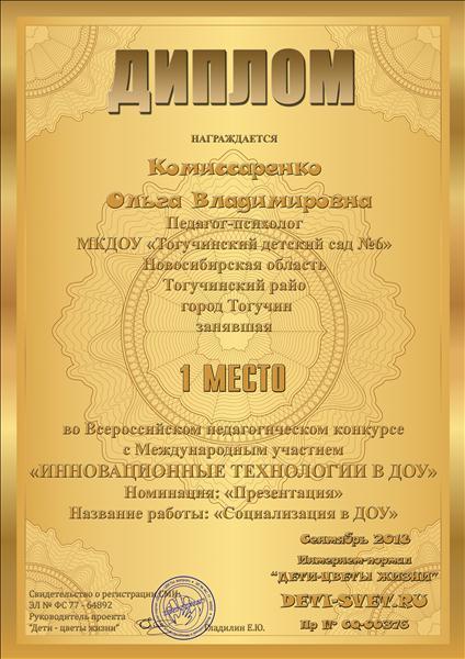 Диплом I место во Всероссийском педагогическом конкурсе с Международны участие "Инновационные технологии в ДОУ" номинация "Презентация" название работы: "Социализация в ДОУ" Интернет-портал "Дети-цветы жизни"