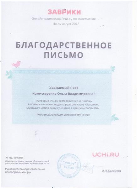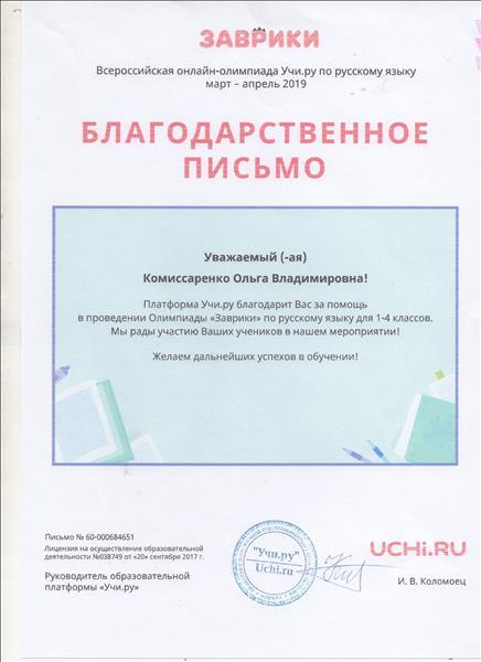 Благодарственное письмо Всероссийская онлайн-олимпиада Учи.ру по русскому языку март 2018