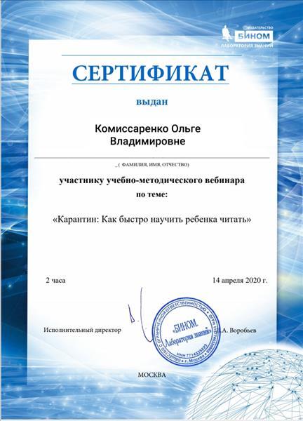 Лаборатория знаний "Бином" Сертификат участника учебно-методического вебинара "Карантин: Как быстро научить ребенка читать"
