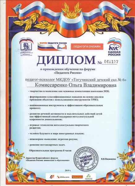 Диплом о прохождении обучения на форуме "Педагоги России" 2019 год