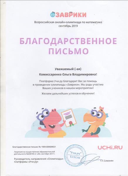 Образовательная платформа "Учи.ру" Благодарственное письмо за помощь в проведении олимпиады по русскому языку