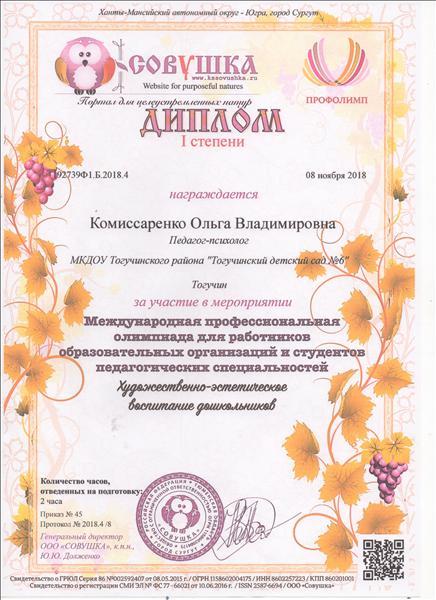 Диплом I степени за участие в мероприятии Международная профессиональная олимпиада для работников образовательных организаций и студентов педагогических специальностей "Художественно- эстетическое воспитание дошкольников" ООО "Совушка"