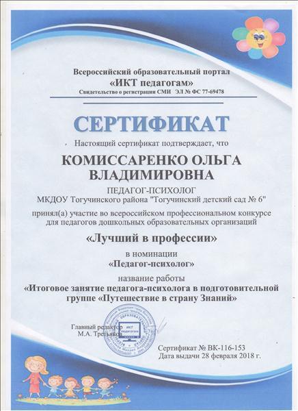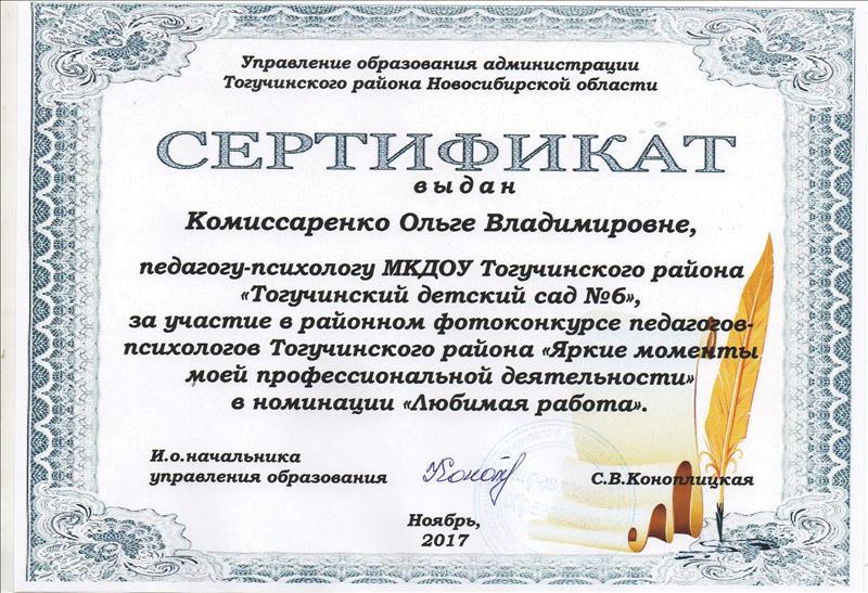 Сертификат участия в районном фотоконкурсе педагогов-психологов Тогучинского района "Яркие моменты моей профессиональной деятельности" в номинации "Любимая работа" Управление образования администрации Тогучинского района Новосибирской области