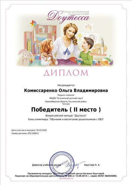 Всероссийский конкурс "Доутесса" Диплом II место Блиц-олимпиада "Обучение и воспитание дошкольников с ОВЗ"