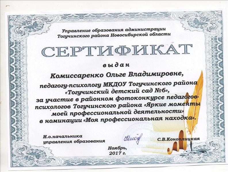 Сертификат участия в районном фотоконкурсе педагогов-психологов Тогучинского района "Яркие моменты моей профессиональной деятельности" в номинации "Моя профессиональная находка" Управление образования администрации Тогучинского района Новосибирской области