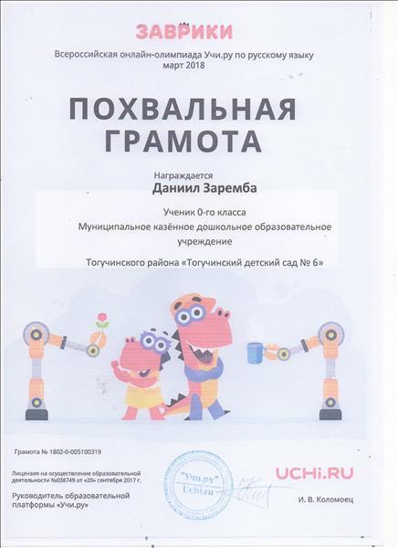 Похвальная грамота воспитанника ДОУ Всероссийская онлайн-олимпиада Учи.ру по русскому языку март 2018