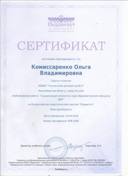 Сертификат о публикации работы: "Социализация личности в ходе образовательного процесса ДОУ" Всероссийский педагогический портал Педдиспут