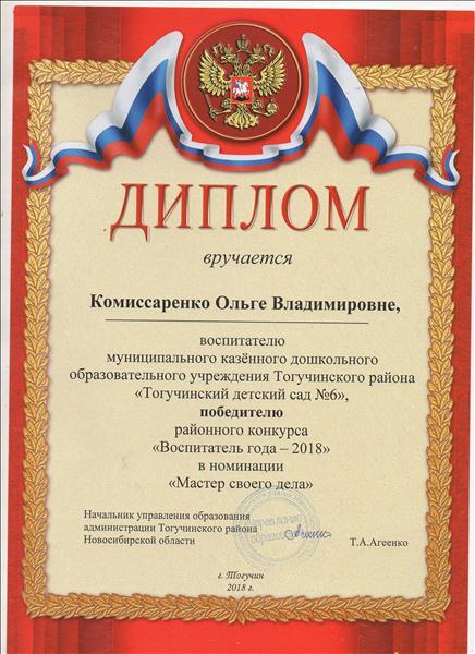 Диплом победителя районного конкурса "Воспитатель года-2018" в номинации "Мастер своего дела" Управление образования администрации Тогучинского района Новосибирской области