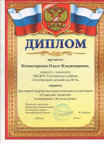 Управление образования администрации Тогучинского района НСО Диплом лауреата фестиваля творчества педагогических коллективов "Созвездие талантов" в номинации "Золотые руки"